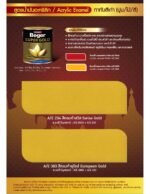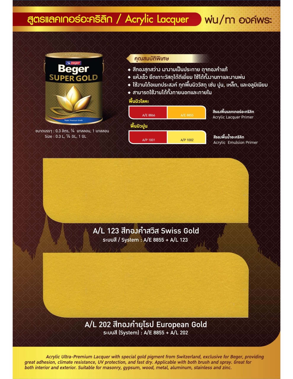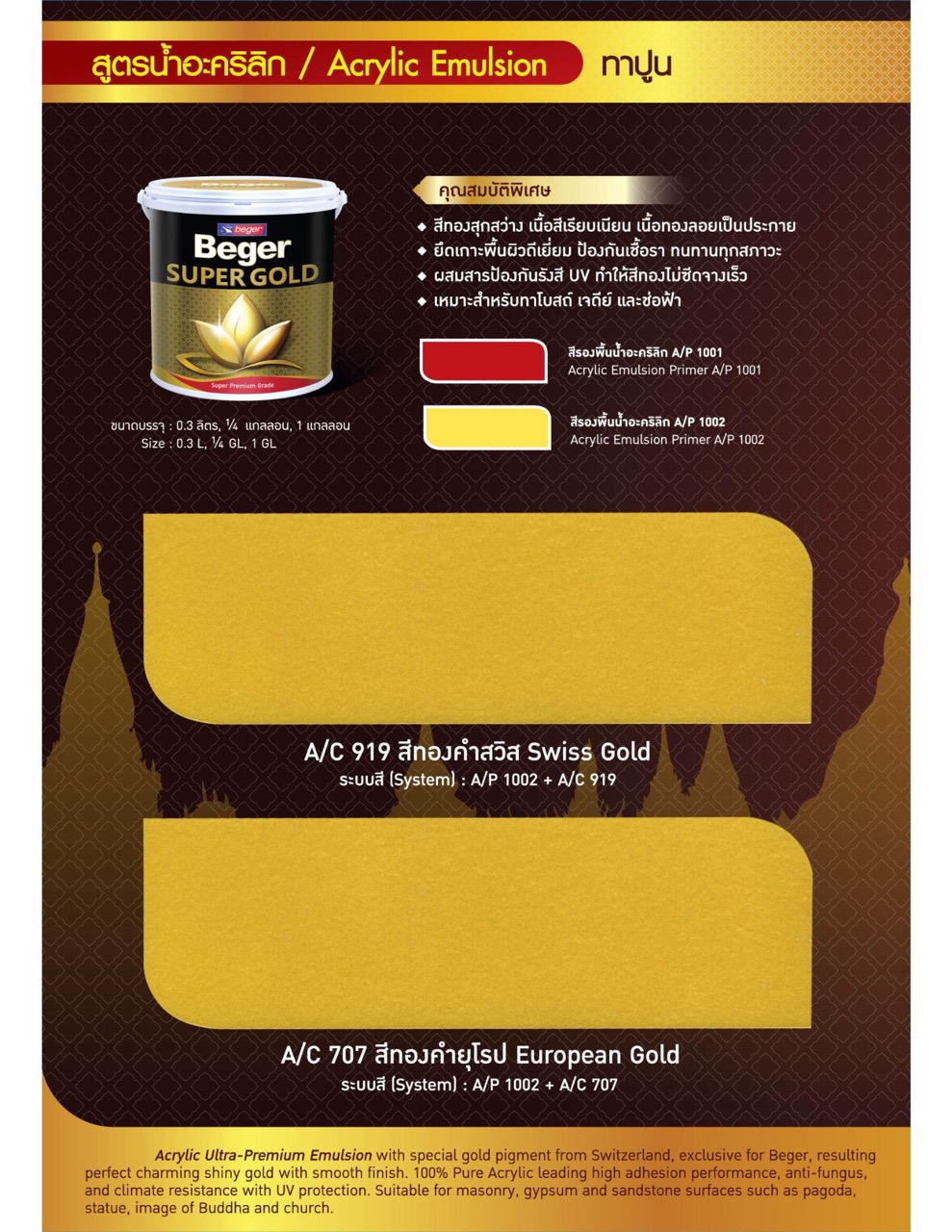 สีทองคำชนิดสีน้ำอะคริลิก เฉดสีทองสวิส เงางามเป็นประกายสวยทุกมุมมอง เปล่งปลั่งสีทองอร่ามดุจทองคำแท้ เนื้อสีแห้งเร็ว สีไม่จม ผงมุกทองชนิดพิเศษจากสวิสเซอร์แลนด์ ลิขสิทธิ์เฉพาะของเบเยอร์เท่านั้น ที่จะให้ความเงางามมากว่า 15 ปี สามารถทาและพ่นได้หลายพื้นผิวทั้งปูน ไม้ และโลหะ เหมาะกับงานบูรณะ วัด โบสถ์ หรืองาน DIY เฟอร์นิเจอร์ ให้สวยหรูดูแพง