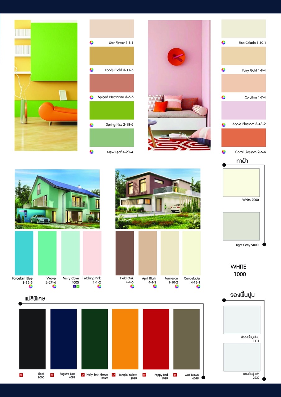แน่น ทนแดด ทนฝน ฟิล์มสีเนียนสวย ปราศจากสารปรอทและตะกั่ว ทนทานต่อเชื้อรา เหมาะสำหรับทาตกแต่ง พื้นผิวปูนฉาบ กระเบื้องแผ่นเรียบ ใช้ได้ทั้งภายในและภายนอกอาคาร
