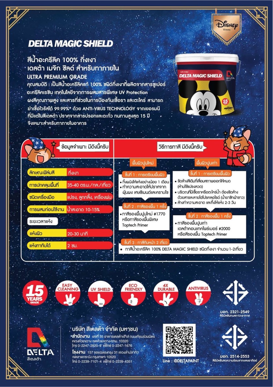 สีน้ำอะครีลิค 100% กึ่งเงา สำหรับทาภายในที่ผลิตจากสารซูเปอร์อะคริลิคเรซิ่น เทคโนโลยีจากการผสมสารพิเศษ UV Protection ผงสีคุณภาพสูง และสารที่ช่วยในการป้องกันเชื้อรา และตะไคร่น้ำ ปราศจากสารปรอทและตะกั่ว ฟิล์มสีสามารถเช็ดล้างได้ ทนทานนานสูงสุด 15 ปี ดิสนีย์ เอกสิทธิ์เฉพาะสีเดลต้าเท่านั้น