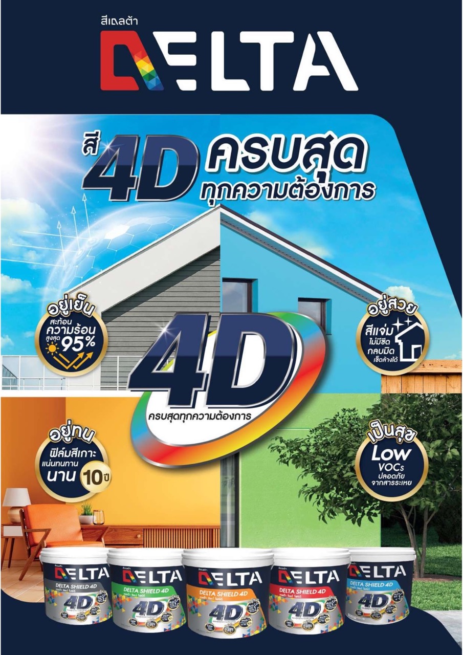 นวัตกรรมที่ผ่านการคิดค้นจาก DELTA QUALITY LAB สีทับหน้า เดลต้าชิลด์ โฟว์ดี มีผงสีคุณภาพพิเศษ ผลิตจากอะคริลิคแท้ 100% ให้คุณสมบัติที่ทนความเป็นด่างได้ดี ป้องกันเชื้อรา และตะไคร่น้ำ ฟิล์มสีทนทาน ด้วยคุณสมบัติ D Cross Bonding ฟิล์มสีเรียงตัวกันอย่างเหนียวแน่น ระดับนาโน ช่วยเสริมการยึดเกาะได้เป็นอย่างดี อีกทั้งยังสามารถกลบมิดพื้นผิวได้ดีเยี่ยม กลิ่นอ่อน ไม่เป็นอันตรายต่อระบบทางเดินหายใจ ทนทานสูงสุด 10 ปี สะท้อนความร้อนได้สูงสุด 95%