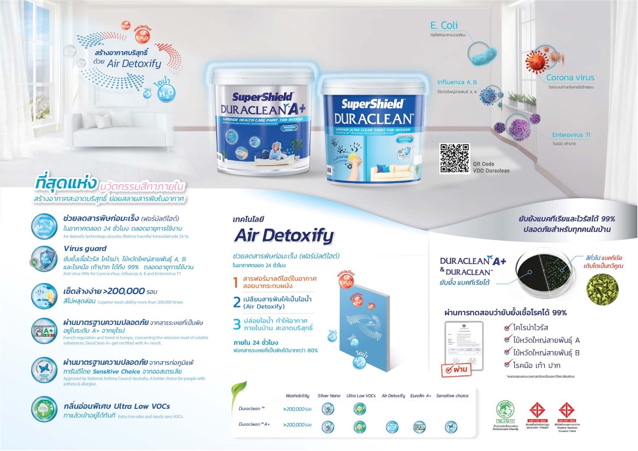 – แบรนด์เดียวในไทยและอาเซียน ที่ผ่านการรับรองมาตรฐานสากล ” French Emission Label ” ซึ่งเป็นมาตรฐานจากประเทศฝรั่งเศส ได้ผลการทดสอบ A+ ว่าปลอดภัยสูงสุดจากการระเหยของสารพิษ ซึ่งทดสอบจากฟิล์มสีที่แห้งเเล้ว (VOCs. บางประเภทสามารถระเหยต่อเนื่องแม้สีแห้งแล้ว การทดสอบ VOCs. จากสีที่ยังไม่ได้ทาจึงอาจไม่พอ)