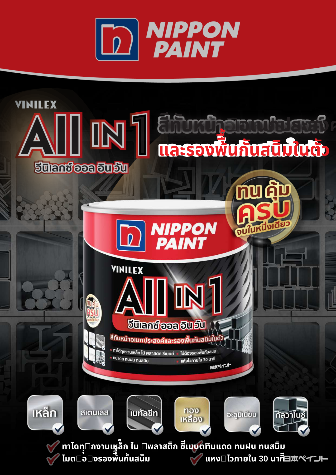 สีน้ำมันกันสนิมในตัว NIPPON Vinilex ALL in 1 1/4กล. S001 สีแดง ชนิดกึ่งเงา