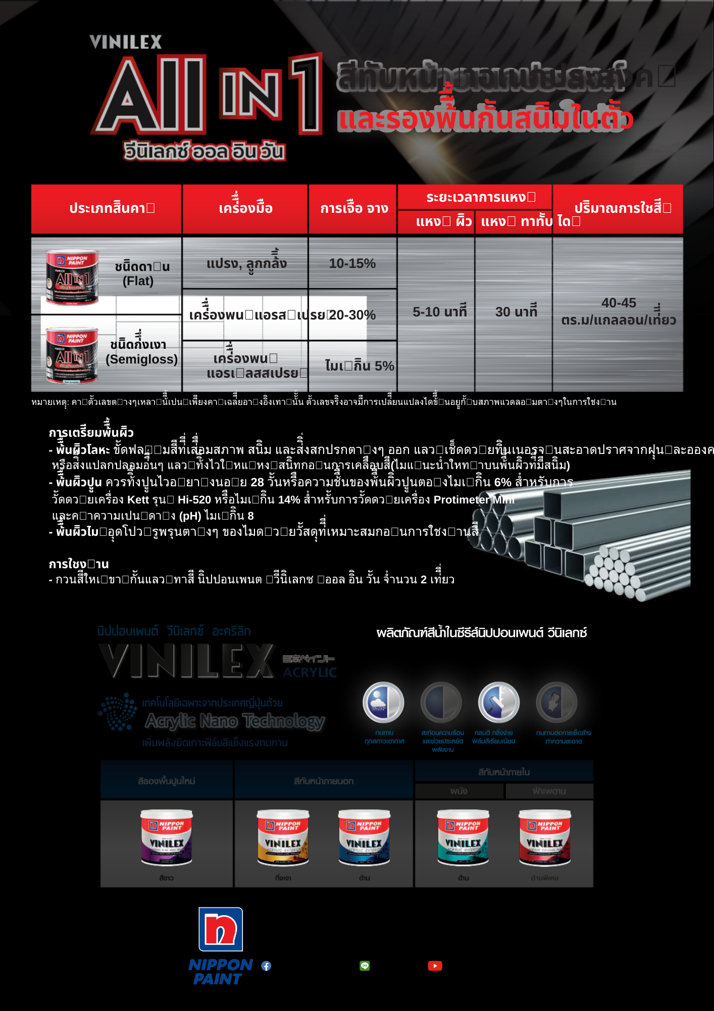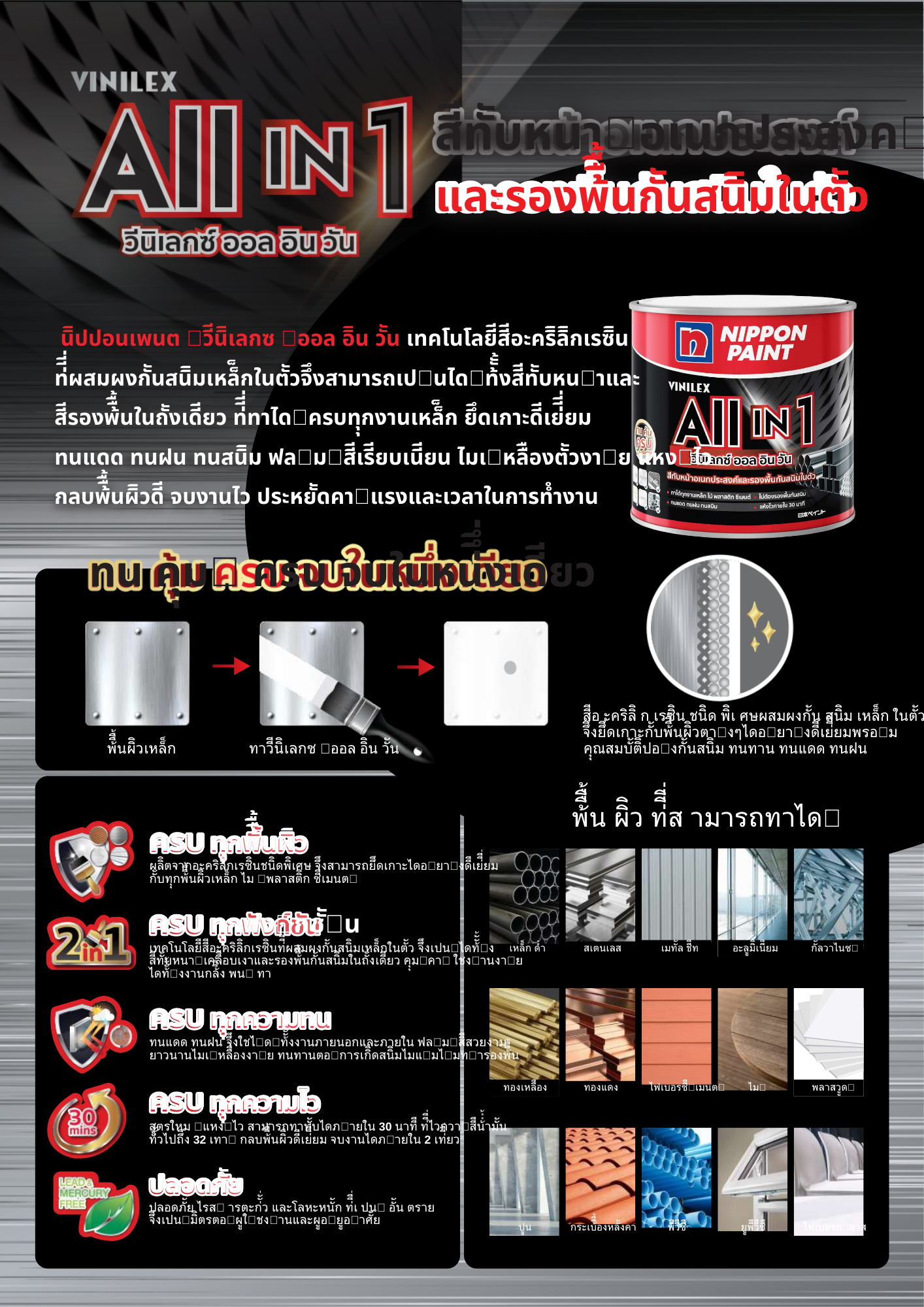 – ครบทุกความทน : ทนทุกสภาวะอากาศ ทั้ง แดด ฝน ลม ผ่านการทดสอบ QUV มาตรฐาน ASTM G 154 และ ผ่านการทดสอบการปกป้องพื้นผิวเหล็ก SST ตามมาตรฐาน ASTM B 117