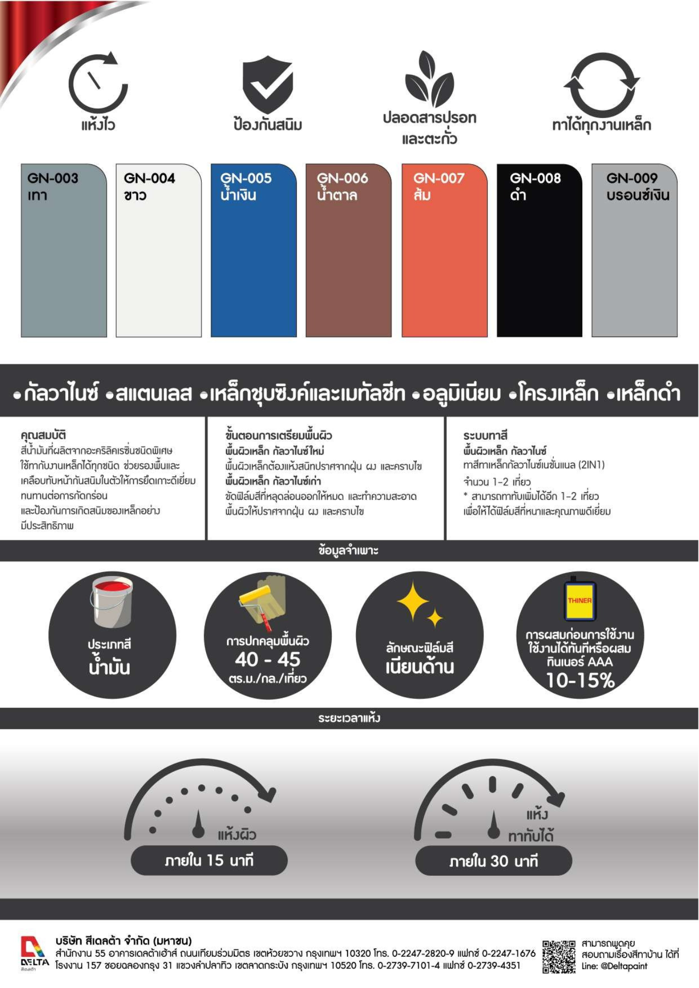 สีน้ำมันที่ผลิตจากอะคริลิคเรซิ่น ทาได้ทุกพื้นผิวเป็นสีเคลือบทับหน้าและรองพื้นกันสนิมในหนึ่งเดียว ทนทานต่อการใช้งานภายนอก ป้องกันการเกิดสนิมเหล็กอย่างมีประสิทธิภาพ เนื้อฟิล์มเรียบเนียน แห้งไว ทาง่ายได้พื้นที่มาก จบทุกงานเหล็ก