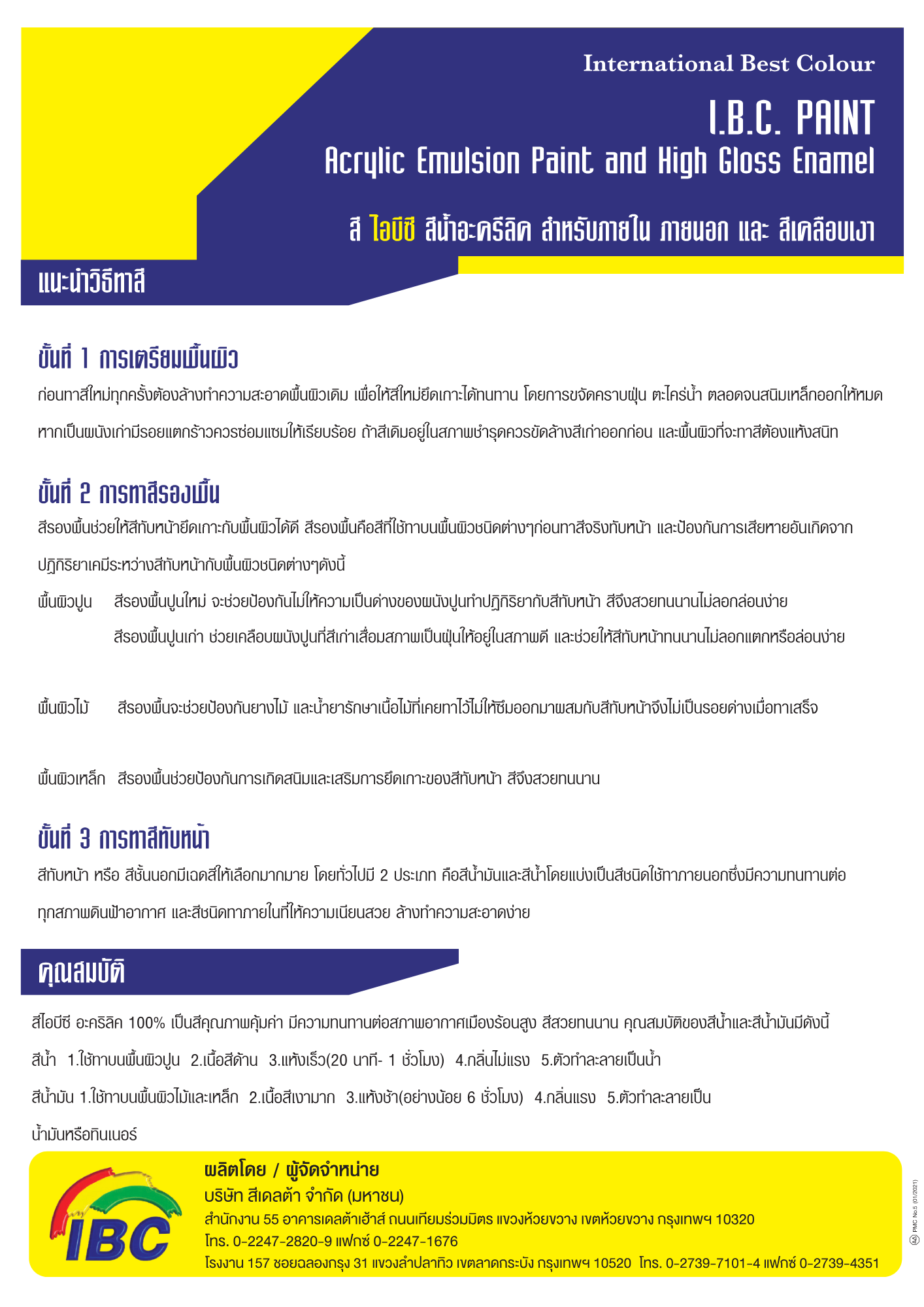 – สามารถใช้ทาได้ทันทีโดยไม่ต้องผสมเจือจาง หากจำเป็นสามารถเจือจางได้ด้วยน้ำยาผสมสีเคลือบเงาไอบีซี น้ำมันสน หรือน้ำมันก๊าด