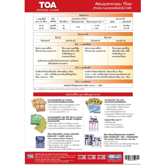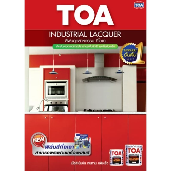 สีพ่นอุตสาหกรรม TOA Industrial LACQUER ผ่านกระบวนการผลิตเฉพาะ จากวัสดุไนโตรเซลลูโลสูเรซิน และผงสีชนิดพิเศษทำให้ฟิล์มสีมีความคงทน สีสันสดใส กลบพื้นผิวได้เยี่ยม สามารถใช้ได้กับพื้นผิวต่าง ๆ เช่น ไม้อัด, ไม้ MDF, ไม้จริง และพื้นผิวเหล็ก เป็นต้น