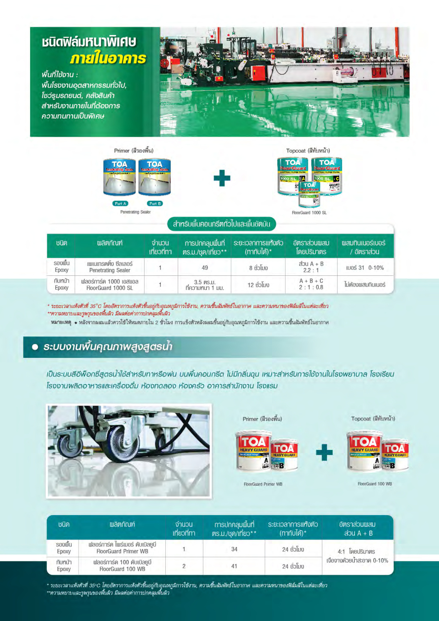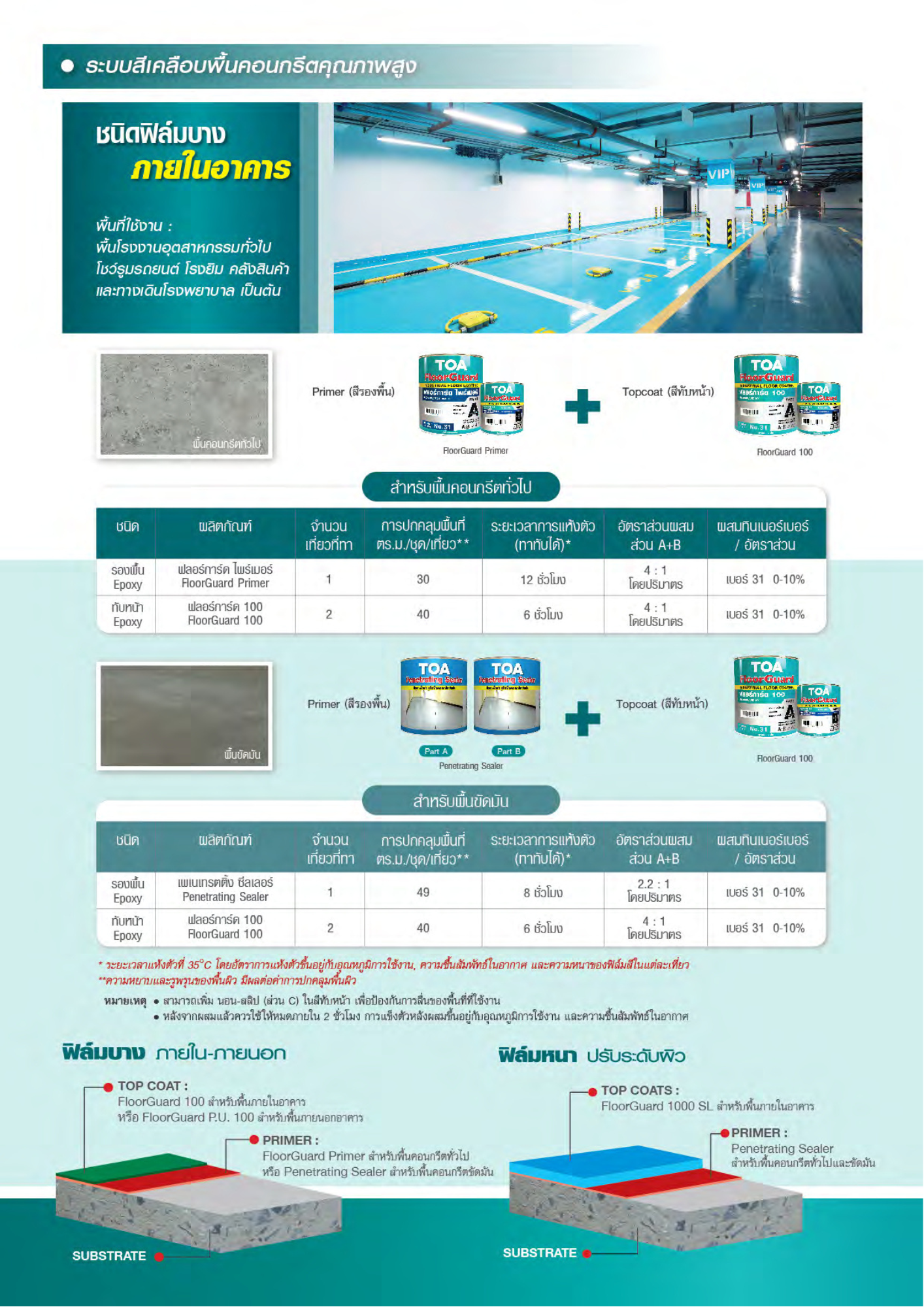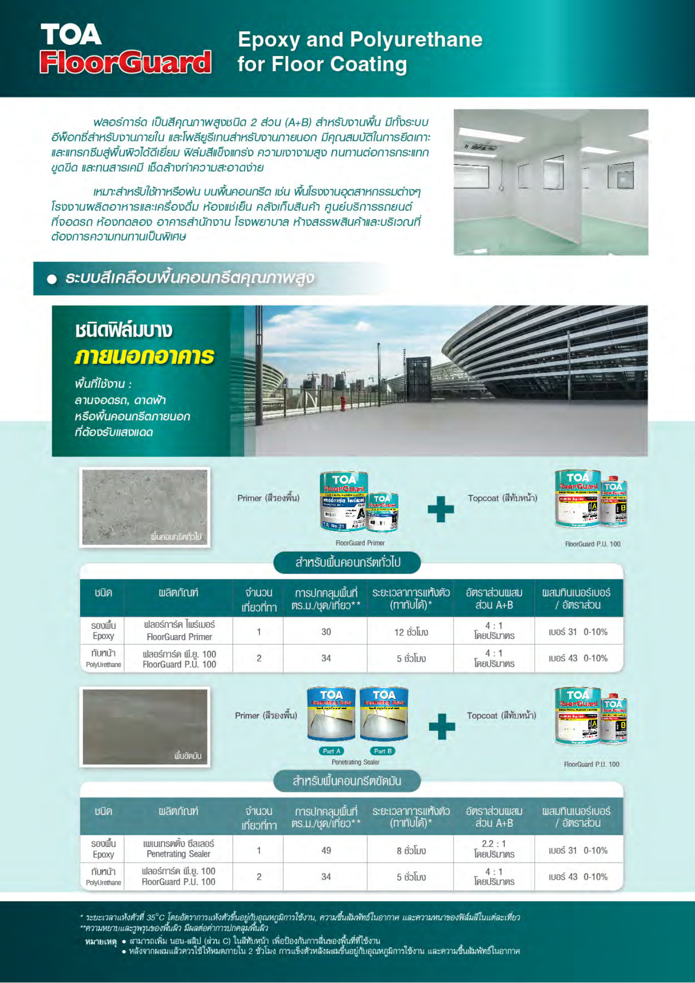 ทีโอเอ ฟลอร์การ์ด 100 สีทับหน้าอีพ็อกซี่ฟิล์มบาง 2 ส่วน สำหรับงานพื้นภายใน เป็นสีอีพ็อกซี่ 2 ส่วน คุณภาพสูง ให้ความเงางาม ปกป้องพื้นผิวดีเยี่ยม
